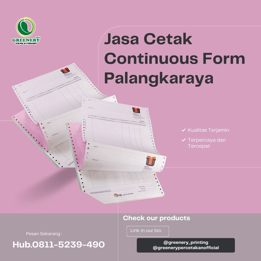 - Greenery Percetakan adalah pilihan terbaik untuk pengadaan cetak continuous form di Palangkaraya. Dengan pengalaman bertahun-tahun, teknologi canggih, desain kustom, harga bersaing, dan pengiriman cepat, kami berkomitmen untuk memenuhi kebutuhan cetakan bisnis Anda. Jangan ragu untuk menghubungi kami dan berkonsultasi tentang proyek cetak Anda. Kami siap membantu Anda menciptakan continuous form yang berkualitas tinggi sesuai dengan kebutuhan Anda.